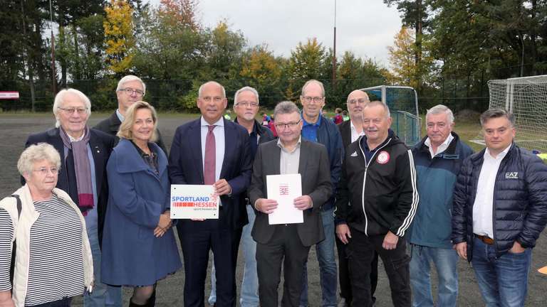 Minister Roman Poseck übergibt den Bescheid an Thomas Weber vom TSV Fellingshausen (M.), mit dabei Bürgermeisterin Patricia Ortmann, die Vorsitzende der Gemeindevertretung, Elke Lepper, Prof. Heinz Zielinski und weitere Vertreter aus Kommunalpolitik und Sportvereinen. © Volker Mattern
